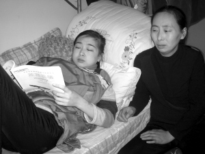 在哈医大二院附近一小区内,记者见到了愁眉不展的于晓军,他14岁的女儿于莹莹躺在床上。身体瘦弱的莹莹脸色苍白,可脸蛋却是圆圆的,细看才知道那是因为浮肿的原因,饱受病痛折磨的小莹莹手里紧紧地握着课本。