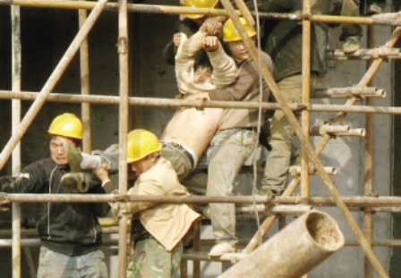 昨天下午3时许,在南京河西江东中路一建筑工地,一名30多岁的木工师傅张某不慎从二楼内作业的脚手架上坠下,没想地面上3根竖立的钢筋不偏不斜刺入其体内,其中两根钢筋从其左右大腿根部贯穿,一根刺入臀部,民工身体悬空,挂在钢筋上不能自救,工友们发现险情,用气割将钢筋割断后才将其救起急送明基医院,经抢救所幸并没有生命危险。