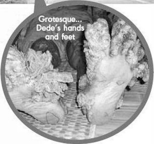 当迪迪20岁时,他身上已经到处长满了树根状的怪瘤,使他的模样看起来异常恐怖。身为建筑工人的迪迪不但再也无法拿工具工作,甚至连一些简单的活都无法完成,最后他遭到了老板的解雇,到今天仍处于失业状态。