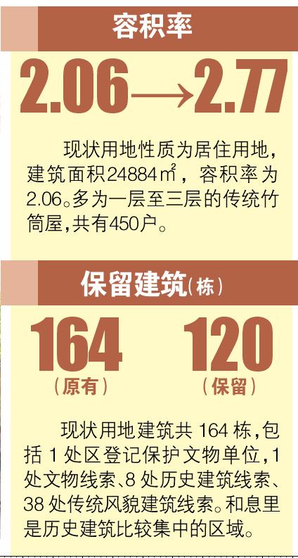 根据《历史文化名城保护规划》,清平市场二期用地位于历史城区环境协调区内,原则上新建建筑高度宜控制在30米以下。本轮方案放弃过去建大型商住楼的思路和大量居民回迁的做法,采用小规模渐进式改造,容积率也由上一轮方案的4.27下降为2.77,只比现状容积率略高一点。改造范围内总共164栋房屋分三类提出保护改造建议: