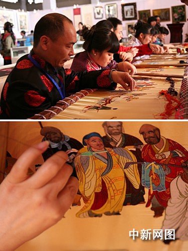 中新网成都11月13日电(刘贤 张浪)今日蓉城艳阳高照,“花重锦官城•首届成都文艺双年展”在此间拉开帷幕。以麻将为材质的雕塑、由一个个针眼大小的字组成的“微书画”《红楼梦》,在比拇指还小的象牙上雕刻的《将进酒》,以及色彩绚丽的蜀绣等等,3000余件精美作品浓缩了成都市的艺术精华。