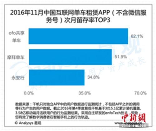 ofo用户次月留存率62.1%、用户活跃度7.2 拿下“双料冠军”