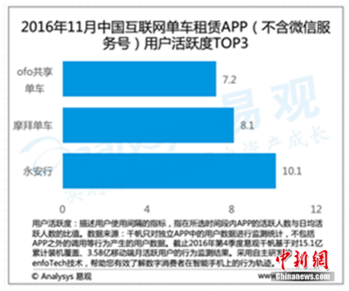 在易观对全国共享单车用户活跃度的调查中,“小黄车”超过摩拜夺得第一。用户活跃度,是指在所选时间段内APP的活跃人数与日均活跃人数的比值。用户月活跃度与日活跃度比值为1,此时用户使用APP的频率最高。反过来,如果用户月活跃度与日活跃度比值较大,那么用户使用APP的频率较低。在易观的数据分析中,ofo共享单车的用户活跃度为7.2,摩拜单车达到8.1,永安行高达10.1, ofo的活跃度数值更小,用户粘性比摩拜单车、永安行更高。