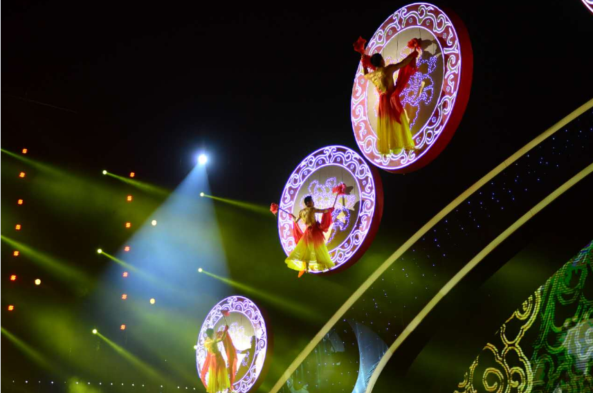 此次开幕式以“花开中国 共铸辉煌”为主题,依凌波湖搭建的开幕式舞台以牡丹花为主题造型,以丝路为辅助造型,经过星星灯的装饰,呈现出光雕视觉效果。在灯光等特效的作用下,舞台与湖面融为一体,结合大型道具、威亚、VR等,打造全息式特效视觉,呈现出人在景中行、人动景观动的效果,整个舞台则随着节目的不同不断变化,观众仿佛在时空中穿梭。