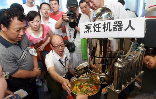 5月23日,在北京科博会上,工作人员端出由烹饪机器人“炒”出的一道菜肴。一款全智能操作的烹饪机器人在北京科博会上吸引了众多观众的眼球。机器人胸前有一个人机互动的屏幕,操作者可以进行菜单选择,将洗好的食材装入标准盒后,用鼠标启动程序,几分钟后,美味的菜肴就会做好。它还能实现远程遥控,即使身在办公室,也可通过网络或手机启动家中的烹饪机器人。新华社发(陈晓根 摄)