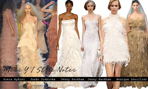 法国老牌设计师Sonia Rykiel细羽设计让整个T台动感飞扬起来。上身材质以丝绸或薄纱为主,下身裙摆缝制细长羽毛,行走之间,飘逸的羽毛让整个人看起来神采奕奕。或全身清一色羽毛,狂野与高贵并进。(PS:个人认为用人工羽毛就好了,不然可能会招致animal protection组织的斥责)
