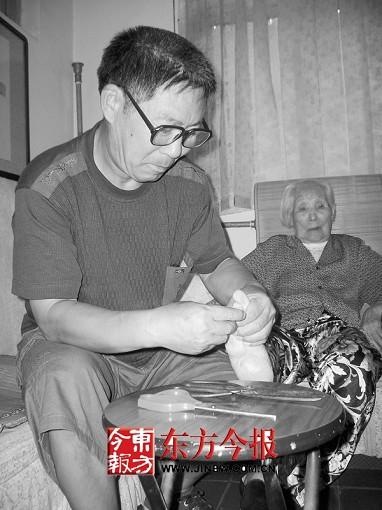 随后,记者走进胡学贤家。只见胡学贤戴着老花镜,弯着腰,正细心地为坐在沙发中的98岁岳母聂俊云修脚指甲。“我妈在年轻时裹过脚,指甲长到肉里面了。不剪的话,她走起路来会非常疼。”胡学贤指了一下剪指甲用的工具说,“剪指甲得有3个步骤,先用大剪子粗剪,再用小剪刀细修一下,最后用普通的指甲刀。”“剪好了,妈!”半个小时后,胡学贤剪完脚指甲,额头上渗出了细小的汗珠。聂俊云望着女婿,微笑着点点头。“妈妈的手脚指甲都是由老胡来剪,比我这个当女儿的还要心细。”老胡妻子梁美玲告诉记者,“人们常说一个女婿半个儿,可俺家老胡比亲生儿还孝顺。”