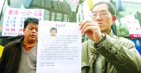 昨日,朝天门汽车站,郜杰的父亲举着寻人启事四处打听儿子的下落 记者 张路桥 摄