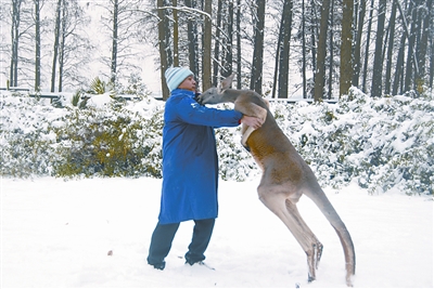 昨日雪后,该园呆在空调房内的3岁雄性袋鼠“美美”想出去玩,一会儿踢食盆,一会儿踢门,饲养员涂炭只好将它放出。“美美”在雪地里跳来蹦去,兴奋不已,并缠着小涂玩摔跤,小涂只好陪它玩玩解闷。摔跤时,小涂用力握住袋鼠前肢,站稳脚跟,“美美”摔了几下也没将他摔倒。突然,“美美”一口咬住小涂的脖子。小涂大吃一惊,慌忙挣脱逃走。