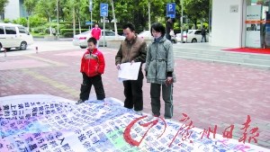 昨日下午1时许,一中年广西男子出现在广州体育西路的人行道上,拉开横幅,声称妻子病重瘫痪命垂危,亟须医疗费。他拉上一子一女,当街兜售亲骨肉及自身器官,只为筹五六万元救妻子一命。
