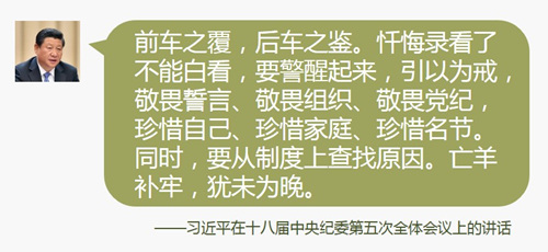 前车之覆,后车之鉴。忏悔录看了不能白看,要警醒起来,引以为戒,敬畏誓言、敬畏组织、敬畏党纪,珍惜自己、珍惜家庭、珍惜名节。同时,要从制度上查找原因。亡羊补牢,犹未为晚。制度好可以使坏人无法任意横行,制度不好可以使好人无法充分做好事,甚至会走向反面。各级党委要紧密结合这些年发生的腐败案例,寻找漏洞,吸取教训,全面深化改革,全面加强制度建设。