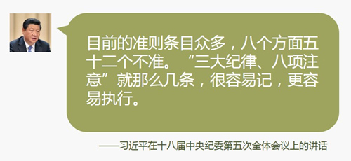依规治党,就要进一步完善党内监督制度,尤其要完善全党一体遵循的准则。今年要着手修订党员领导干部廉洁从政若干准则。目前的准则条目众多,八个方面五十二个不准。“三大纪律、八项注意”就那么几条,很容易记,更容易执行。刘邦进入咸阳城,听从樊哙、张良的忠告,提出了约法三章,就两句话:杀人者死,伤人及盗抵罪。修订准则要化繁为简、突出重点、针对时弊,解决领导干部从政过程中存在的突出问题,使广大党员、干部一目了然。