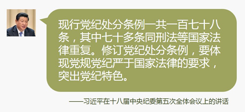 党纪就是红线,处分就是惩戒。党纪处分条例要体现从严治党、加强纪律建设的要求。现行党纪处分条例一共一百七十八条,其中七十多条同刑法等国家法律重复。修订党纪处分条例,要体现党规党纪严于国家法律的要求,突出党纪特色,重点对违反党的政治纪律、组织纪律、财经纪律、工作纪律和生活纪律的行为作出处分规定。