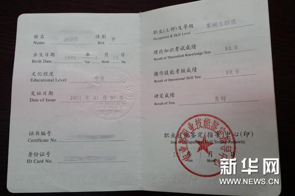 有了李保国的“传帮带”,岗底村产生了一批“永久牌”的土专家。现如今岗底已有191名果农获得国家颁发的果树工证书,他们不仅自己能致富,还长年活跃在山区传授技术。图为岗底村村民的果树工证书。新华网记者 张雪花 摄
