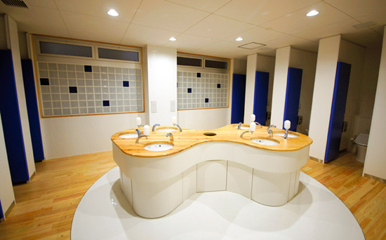 明亮的内部装饰、全身镜等,日本滋贺县近江八幡市的市立桐原东小学的厕所整洁时尚,其中还配备了清洗马桶和模仿水流声音的装置。