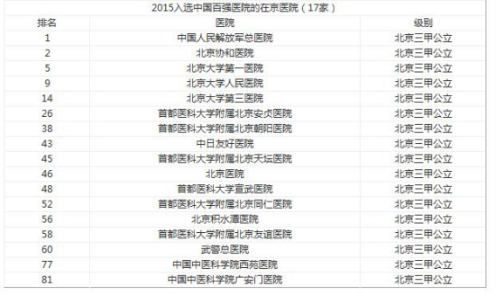 2015年,全国最强的10家医院中有4所在京医院。10强医院排名依次为中国人民解放军总医院、北京协和医院、四川大学华西医院、复旦大学附属中山医院、北京大学第一医院、上海交通大学医学院附属瑞金医院、中山大学附属第一医院、第四军医大学西京医院、北京大学人民医院、华中科技大学同济医学院附属同济医院。