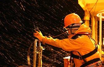 科考队员进行舯部甲板回收CTD(海水温盐深剖面仪)作业(3月2日摄)。新华社记者白国龙摄