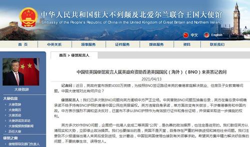 记者问:近日,英政府宣布拨款4300万英镑,为按照BNO签证路径来英的香港家庭解决就业、住房及子女教育等问题。中国大使馆对此有何评论?
