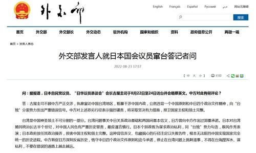 有记者提问:据报道,日本自民党议员、“日华议员恳谈会”会长古屋圭司于8月22日至24日访台并会晤蔡英文。中方对此有何评论?