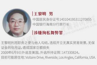 根据中国公布的资料,王黎明1953年11月27日生人,现年64岁,他和妻子王玉兰均遭中国警方通缉。出逃前王黎明是中国银行海南省分行行长,王玉兰是海南三洋德林药业有限公司副董事长,两人均涉嫌严重经济犯罪而上了“红通”。
