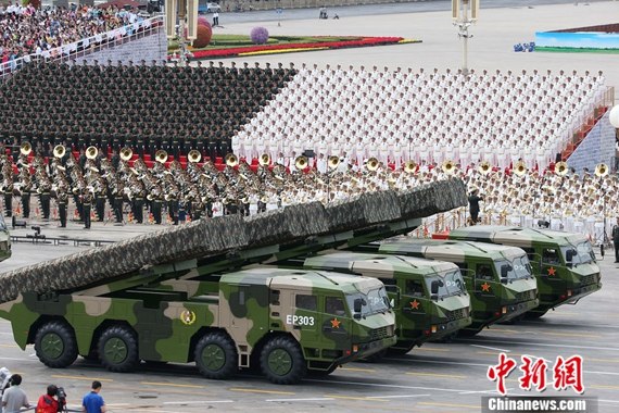 中新社北京9月3日电?(高凯 周波 柏贵念)纪念中国人民抗日战争暨世界反法西斯战争胜利70周年阅兵式3日在北京天安门广场举行。参加阅兵的常规导弹第三方队展示的是长剑10A巡航导弹。长剑10A巡航导弹,能够动态化识别目标,超低空隐蔽突防,多角度连续攻击,是中国军队实施精打要害、克敌制胜的“杀手锏”。