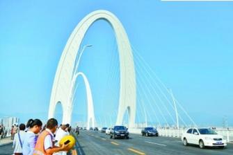 这座兼具力与美的雄伟大桥仿佛一件巨大的钢铁艺术品。大桥标志性的造型是两座外倾的门形钢塔,一高一低,通过一条条斜拉索,拉起全桥近3万吨重的钢箱梁。从远处看,好像两个面对面坐在地上的人,脚抵着脚,手拽着钢索,各自向后拉伸。通行于这段名为“合力之门”的主桥上,仿佛穿越着时空隧道。