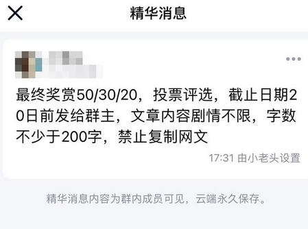 通常,群成员在群里发布女性照片后,群成员会对图片发表评价,常常有人“志愿”为照片“配羞辱文”。据群主发布的公告,群内还会举办比赛,群成员可以投稿“配文”领奖,投稿字数不少于200字,结果由群成员投票评选,最终奖赏分为50元、30元、20元三个档位。除了“志愿”书写,群内也有写手定制撰写“配文”。一名在群内有偿招募配文写手的群成员告诉澎湃新闻记者,写手写一篇“配文”酬劳在10元到40元不等,一天需要写4-8篇,要求“脑洞大,字数够”。