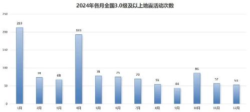 2024年,我国共发生3.0级以上地震1066次,3.0到3.9级738次,4.0到4.9级267次,5.0到5.9级54次,6.0级到6.9级5次,7.0级以上2次,最大地震是4月3日在台湾花莲县海域发生的7.3级地震。其中,我国大陆共发生3.0级以上地震889次,3.0到3.9级735次,4.0到4.9级129次,5.0到5.9级24次,6.0级到6.9级0次,7.0级以上1次,最大地震是1月23日在新疆阿克苏地区乌什县发生的7.1级地震。