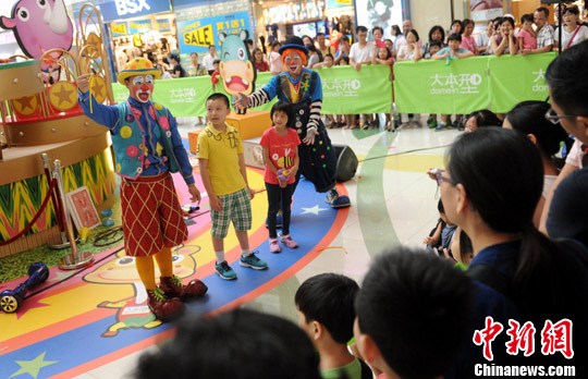7月23日,有“香港小丑王”美誉之称的吴浩宾(左一),下午在油塘一个商场向市民献技。中新社记者 谭达明 摄