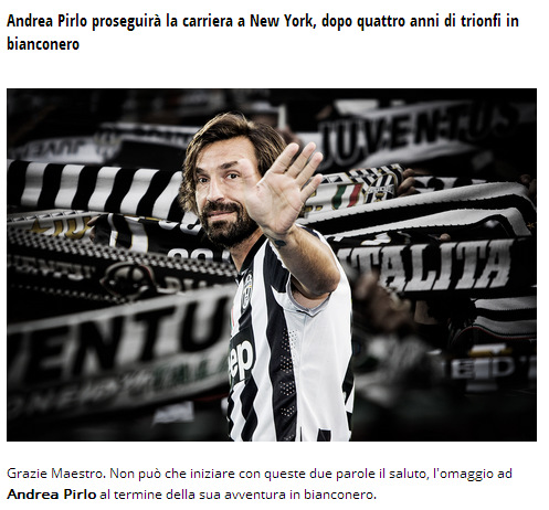 尤文官网发布了一篇长文来致敬这位伟大的本土球员,标题就是《感谢你所做的一切!大师!》 ,因为自2011年以32岁的高龄加盟球队以来,皮尔洛帮助尤文连续四年称霸意甲,并且在意甲整体低迷的时代,助球队神奇般地杀入了2014-2015赛季欧冠决赛。在职业生涯期间,皮尔洛几乎拿遍了所有的荣誉,除了意甲冠军之外,他是2006年世界杯冠军队的主力成员,还曾两度随米兰捧得欧冠联赛的大耳朵杯。