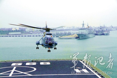 直升机从井冈山号的舰尾飞行甲板上起飞(资料图)