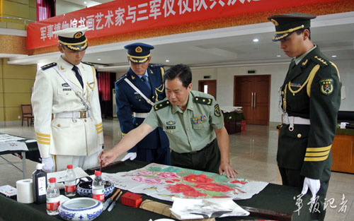 中新网7月31日电 据中国军网记者频道报道,7月30日,军事博物馆组织书画艺术家到中国人民解放军三军仪仗队为官兵现场题字作画,共同迎接建军85周年。(解放军报记者 徐叶青)