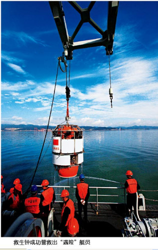 救生钟在船吊和绞车的牵引下,缓缓潜入海中。15分钟后,救生钟与“失事”潜艇成功对接。救援人员立刻与艇内取得联系,并将部分“遇险”艇员救至救生钟内,并将潜艇所需物品和相关配件送达“失事”潜艇。随后,救生钟浮出水面,艇员安全“获救”。潜艇也随即抢修完毕,动力恢复,安全返回母港。