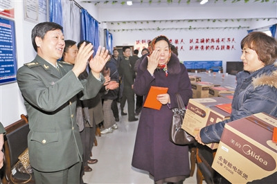 1月21日下午,新疆军区派出机关干部走访慰问团,驱车来到某荣军医院,为伤残军人及军属送来御寒衣物和生活用品。 (曹一曲摄)
