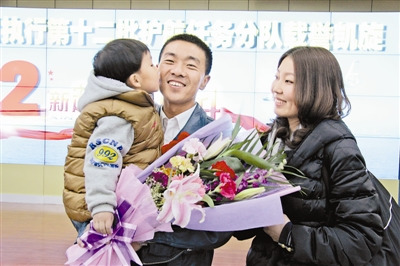 1月20日,刚刚圆满完成第十二批亚丁湾护航任务载誉凯旋的海军某部飞行员禚玉峰,与分别6个多月的妻子、儿子幸福团聚。瞧,小家伙的甜甜一吻,让“护航爸爸”脸上笑开了花。(胡宝良摄)