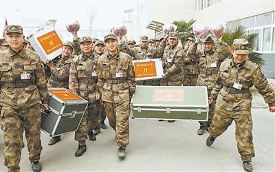 为了让官兵过一个欢乐祥和的新春佳节,连日来,南京军区政治部文化工作站徐州影视发行管理中心为基层部队赠送文化器材。图为1月17日,该中心工作人员把数字放映机、篮球、排球送到某部新兵营二连,手捧新年礼物的官兵喜上眉梢。(揭宾耀 摄)