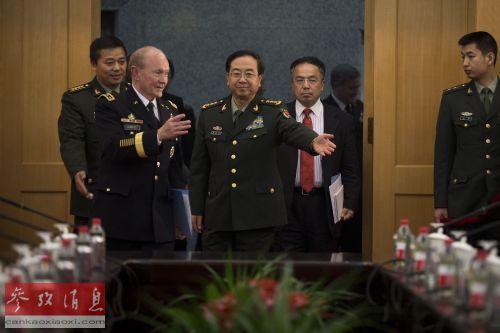 4月22日,美军参谋长联席会议主席登普西(前排左一)访华期间,在北京八一大楼与解放军总参谋长房峰辉(前排左二)举行会谈。