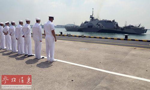 资料图:4月18日,在新加坡樟宜海军基地,美国海军军人列队注视美国海军“自由”号濒海战斗舰抵达码头。当日,“自由”号濒海战斗舰抵达樟宜海军基地,开始在东南亚地区的部署计划,这是“自由”号首次在海外部署。新华社/路透