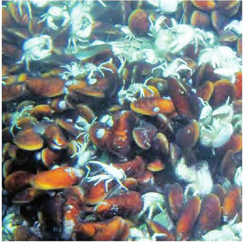 12时35分,“蛟龙”号到达冷泉区边缘地带,并传回了第一张海底图片。图片显示的海底十分荒凉,冷泉形成的碳酸盐岩像礁石一样横卧在海底,已经死亡的贝类零星地散布在海底泥上。