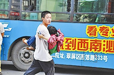 图①:黄子恒抱着女考生准备去医院。(网友抓拍)