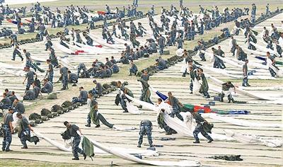 5月24日,空降兵某训练场上空,大型运输机飞行在1000米高度,“跳……”投放教员一声令下,新兵们接连跃出机舱,空中朵朵伞花竞相绽放。这是今年空降兵某师组织新兵第9次跳伞训练。