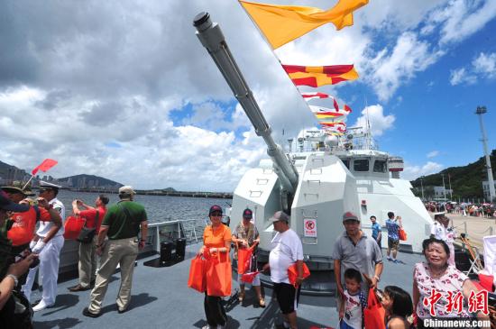 7月1日,中国人民解放军驻香港部队昂船洲军营开放日,香港市民争睹新入列的056型轻型护卫舰“惠州”舰、“钦州”舰。中新社发 陈文 摄