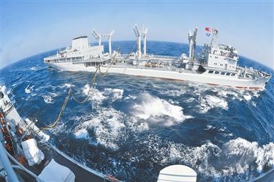 7月4日,参加“海上联合-2013”中俄海上联合军事演习的中方舰艇编队进行首次海上补给。 本报记者 孙 阳摄
