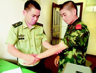 为做好秋季卫生防病工作,确保官兵身体健康。连日来,省武警二支队医疗小组深入基层中队班排,通过举行健康讲座、现场诊治和发放药品等形式,广泛开展“医疗服务下基层”活动。图为该支队医生为基层战士诊治。(谢兆松 刘佳)
