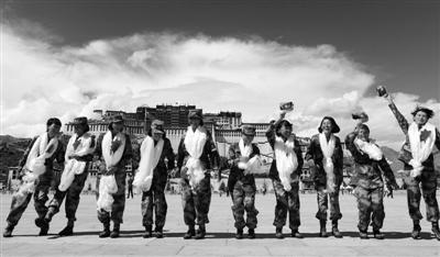 图为第一批10名女兵出发前在布达拉宫广场庆祝即将踏入部队。 本报记者 张琪 摄