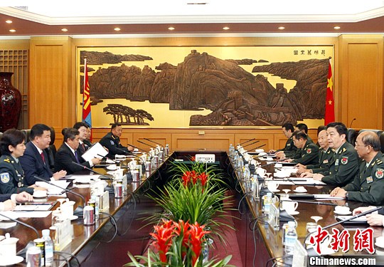 中新社北京9月18日电 (记者 王曦)国务委员兼国防部长常万全18日下午在北京八一大楼与蒙古国国防部长巴特额尔登举行会谈。双方就地区安全形势和两国两军关系等共同关心的问题交换了意见。