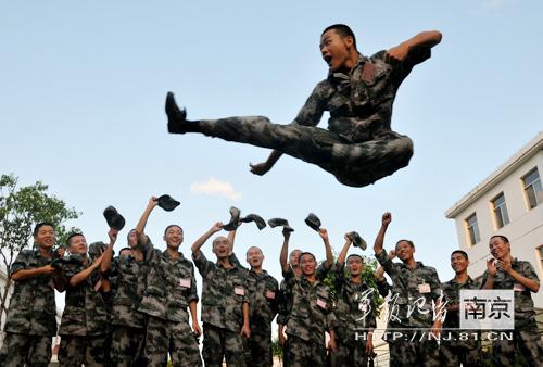 南京军区某部新兵训练间隙秀武术绝活(图)