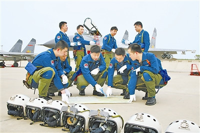 10月10日上午,辽东半岛某机场,随着空军航空兵某部指挥员一声令下,一架架战机拖着尾焰,跟进起飞,进行高难度对抗“空战”。该部通过设置逼真的战场环境,在强强对抗中不断提升部队真打实备能力。(特约记者 曹占礼)
