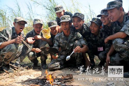 中新网10月11日电 据中国军网记者频道报道,近日,南京军区某部组织新兵挺进深山,摘野菜、挖炉灶、制野味,亲身体验野外生存训练,增强新兵野外生存能力。图为班长用工兵锹煎鸡蛋让新战士目瞪口呆。(吴达)