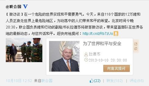 北京时间10月10日晚20:30--22:00,联合国负责维和行动的副秘书长拉苏德做客微博回答网友的提问。晚些时候拉苏德启程访华,这是他就任联合国副秘书长后第一次访华。
